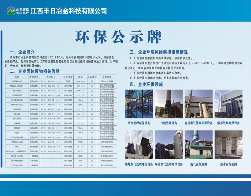 江西豐日冶金科技有限公司江西豐日冶金科技有限公司成立于2012年3月,注冊資金15000萬元,現(xiàn)為山東環(huán)保集團旗下控股子公司,落戶于江西省宜春市袁州醫(yī)藥工業(yè)園。公司年回收再生十萬噸廢舊鉛酸蓄電池項目占地62.41畝,總建筑面積42180㎡,總投資3.5億元,于2020年5月份投入生產(chǎn),自生產(chǎn)以來運行穩(wěn)定,年產(chǎn)值達10億元以上,年納稅1億元以上。